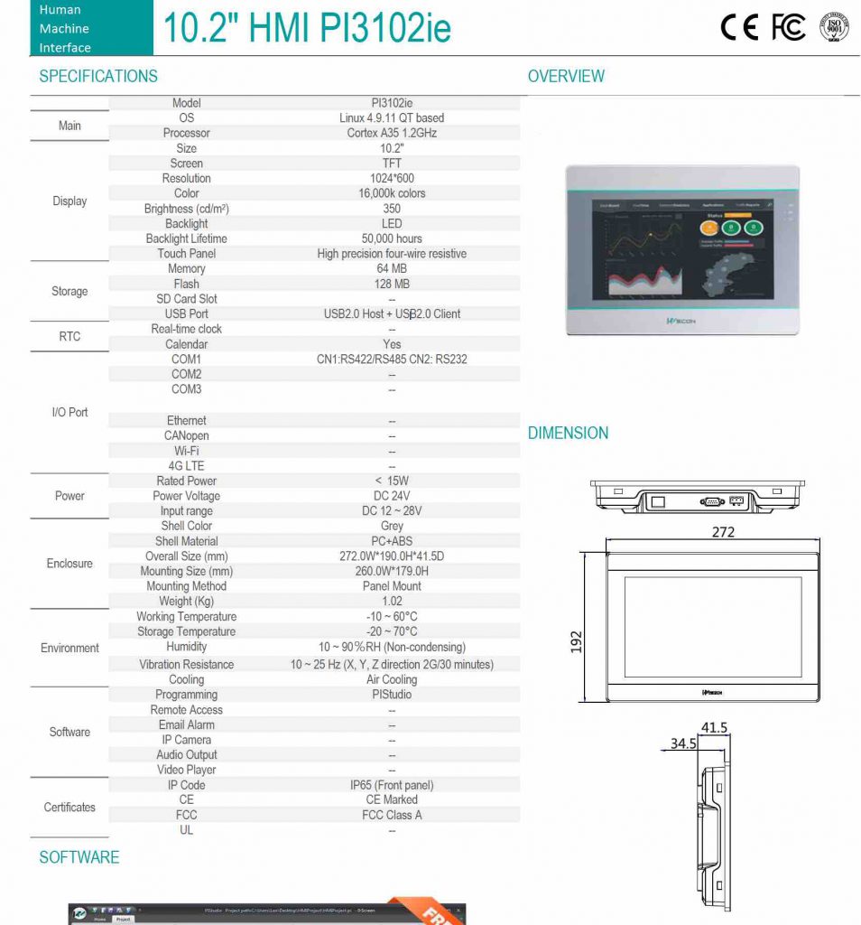 10″ HMI Touch Screen: PI3102ig, PI3102ie with remote control and cloud storage, and optional WIFI, 4G.